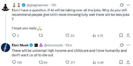 马斯克:“不希望人类灭绝” 0561news 2026年01月29日 23:47 11 0 有网友问,“埃隆,我有个问题。既然人工智能终将接管所有工作,你明明清楚未来就业岗位会减少,为什么还建议大家多生孩子呢?” 马斯克对此回应称:“将会有全民高收入和育儿福利,而且我热爱人类,不希望我们走向灭绝。”