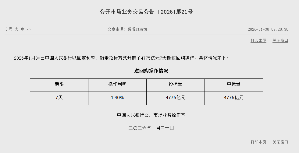 央行开展4775亿元7天期逆回购操作 0561news 2026年01月30日 11:08 12 0 1月30日金融一线消息,2026年1月30日中国人民银行以固定利率、数量招标方式开展了4775亿元7天期逆回购操作。