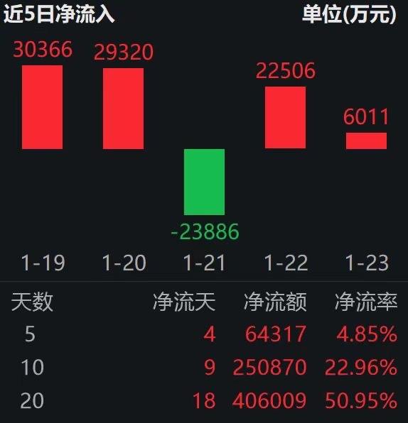 工业有色ETF万家(560860)备受资金青睐,资金连续两日净流入,合计“吸金”超2.8亿元,近10日“吸金”超25亿,近20日“吸金”超40亿元。截至1月23日,该基金最新规模达143.78亿元。