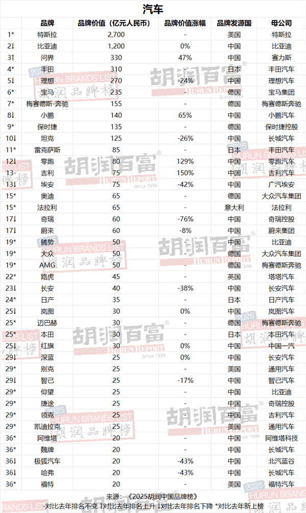 凤凰网科技讯 2月3日,胡润研究院发布《2025胡润中国品牌榜》,其中汽车品牌价值榜单同步出炉。榜单显示,特斯拉以2700亿元的品牌价值位列榜首,比亚迪与问界分列第二、三位。