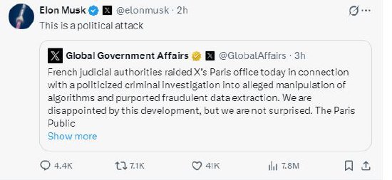当地时间周二,法国巴黎检方表示,已对美国企业家马斯克旗下社交媒体平台X在巴黎的办公场所展开搜查。