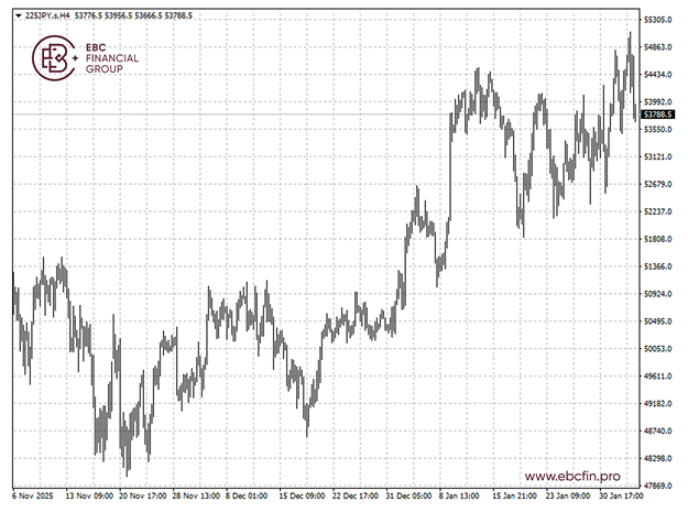 日经225指数在波动加剧的背景下维持长期上升趋势。只要能守住53490点的低位支撑,重返55000点关口的可能性很大。