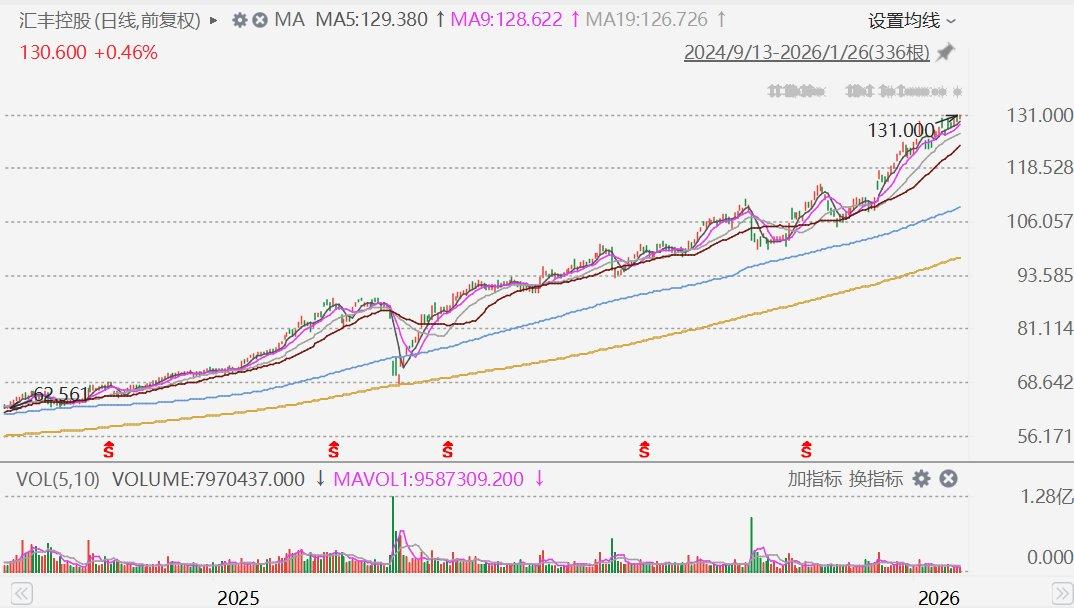 格隆汇十大核心――汇丰控股创历史新高 0561news 2026年01月26日 15:49 21 0 入选了2026年格隆汇“全球视野”十大核心资产的汇丰控股(0005.HK)盘中涨近1%至131港元,股价创历史新高,市值达2.25万亿港元。