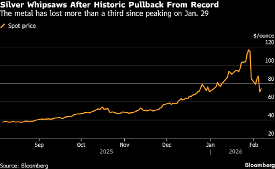 受市场规模较小且流动性相对不足影响,白银价格波动向来比黄金更为剧烈。但近期白银波动无论幅度还是速度都格外极端,为1980年以来最剧烈水平,投机动能叠加场外交易流动性萎缩进一步放大了波动幅度。自1月29日触及历史高点以来,白银价格已累计下跌逾三分之一。