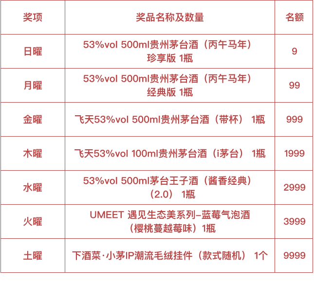 2月16日09:00-3月3日23:59,小茅将在i茅台APP开启“策马纳千祥 春节不打烊”有奖问卷活动。活动期间,亲们可登录i茅台APP,通过点击首焦、弹窗等方式进入活动页面参与答题,完成问卷后即可获得抽奖资格。届时,系统将自动通过区块链进行抽奖,抽奖结果由第三方权威机构进行公证。您有机会抽取以下奖品: