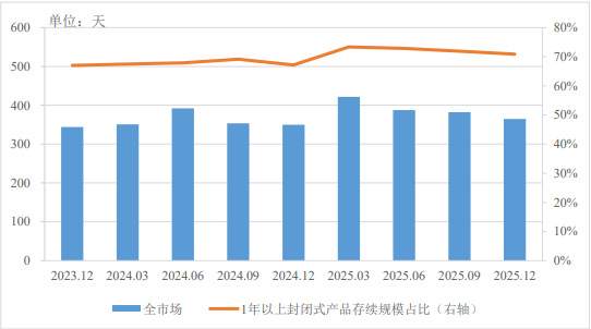 理财产品类型结构方面,2025年,新发封闭式理财产品加权平均期限在322至489天之间,为市场提供了长期稳定的资金来源。截至2025年末,1年期以上的封闭式产品存续规模占全部封闭式产品的比例为70.87%,较年初增加3.72个百分点。