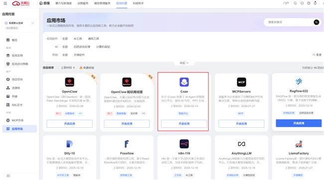 在办公方面,息壤应用托管最新上线Coze,这是一款基于AI Agent的智能办公平台,集成AI写作、PPT生成、网页开发与AI设计等一体化生产力工具,支持零代码打造专属AI助手;应用托管对Coze及配套生态进行打包整合,直连火山方舟Doubao-Seed-1.6大模型内核,无需编写代码即可快速落地AI智能体,并可按需调用天翼云云端资源实现弹性伸缩,支持7×24小时稳定运行,按量计费、成本更可控;同时支持可视化拖拽节点与零代码编排工作流,灵活适配企业专属流程,配套实名认证与专属API Key等安全机制,并支持模型API Key/Endpoint ID配置,便于调用大模型算力。方案可广泛应用于金融风控报告生成、医疗问诊预筛、政务智能应答等场景,帮助企业以零代码、零运维方式获得高效可用的智能体能力。Coze息壤应用托管部署步骤:【登录天翼云官网应用托管控制台】-【应用市场】-选择“Coze”点击“部署应用”即可完成部署。
