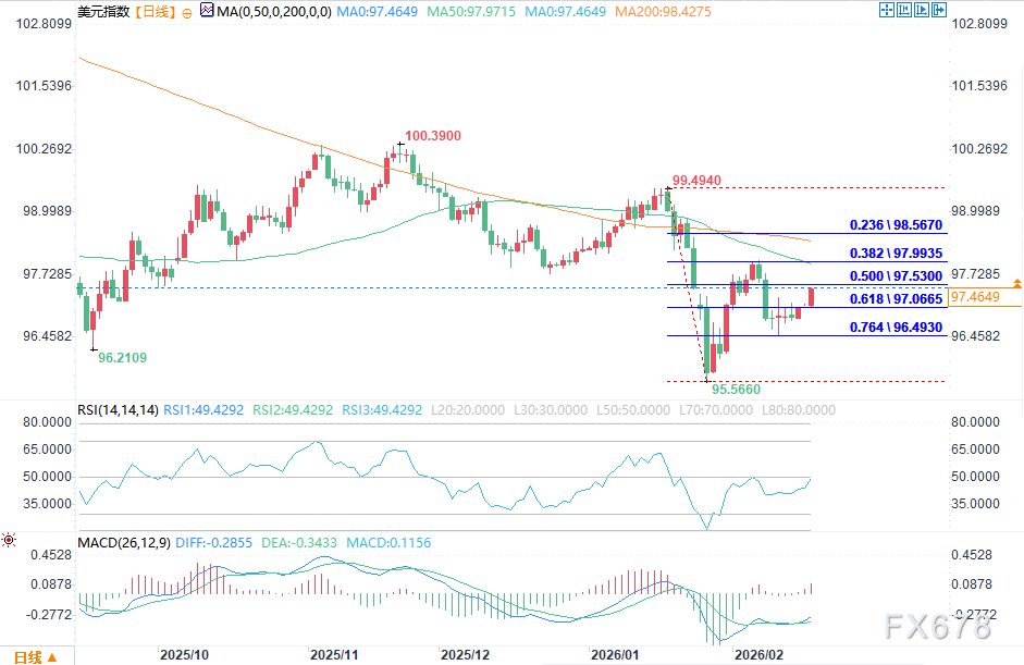 这属于典型的避险买盘,意味着美伊局势若进一步升级,美元指数有望进入97.522―97.987关键回撤区间,甚至可能上破97.973阶段高点。