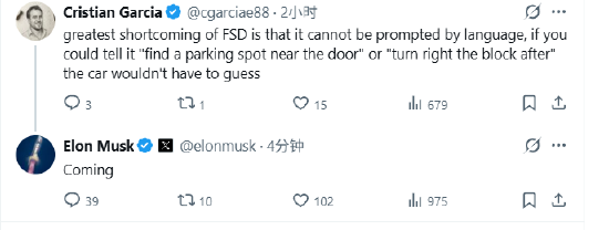 马斯克称特斯拉FSD语音控制功能即将推出 0561news 2026年02月21日 15:25 5 0 一位网友评论称:“FSD更大的缺点在于它无法通过语音来触发操作。如果你能告诉它“在门口附近找个停车位”或者“过一个街区后右转”,汽车就不用猜测了。” 马斯克回应称:“即将推出。”