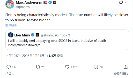 风投大佬马克·安德森回应称:“埃隆一如既往地谦虚。实际数字可能接近5万亿美元,甚至更高。”