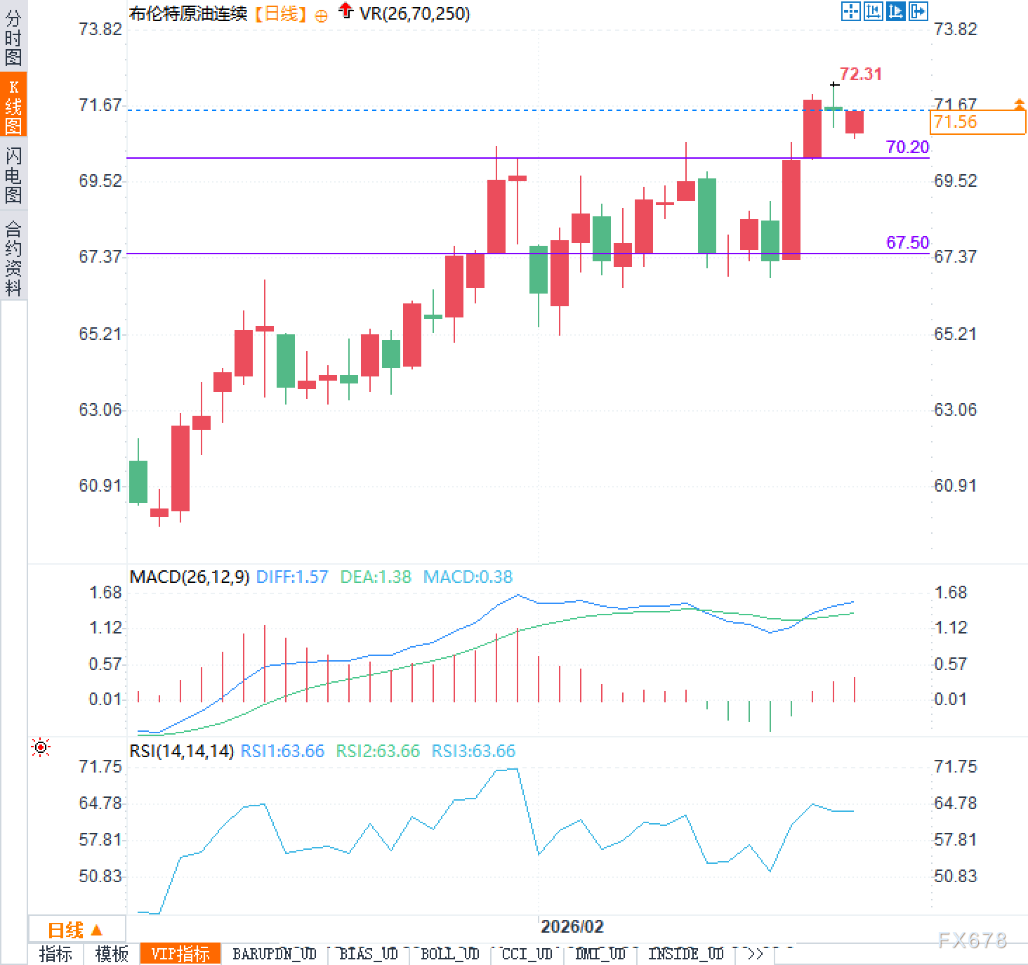 技术面上,日线图显示价格正处于前期抬升后的高位整理区间。上方72.31美元附近构成了阶段性强压,若要有效突破,往往需要新的强 *** 来进一步抬升风险溢价或吸引趋势资金跟进。下方则需重点关注70.20美元一带的回撤承接力度,而更关键的支撑位于67.50美元附近,该位置更接近此前震荡区的中枢,一旦失守,市场可能会重新评估当前的溢价水平是否过高。指标方面,MACD参数显示DIFF为1.57,DEA为1.38,MACD为0.38,虽属多头结构但动能并非极端强势,更像是上涨后的高位修复;RSI为63.66,处于偏强但未到过热的区间,符合“强势震荡”而非“单边加速”的状态。综合来看,布伦特原油当前更像是在用时间换空间,等待美伊周四会谈结果这一终极变量的揭晓。