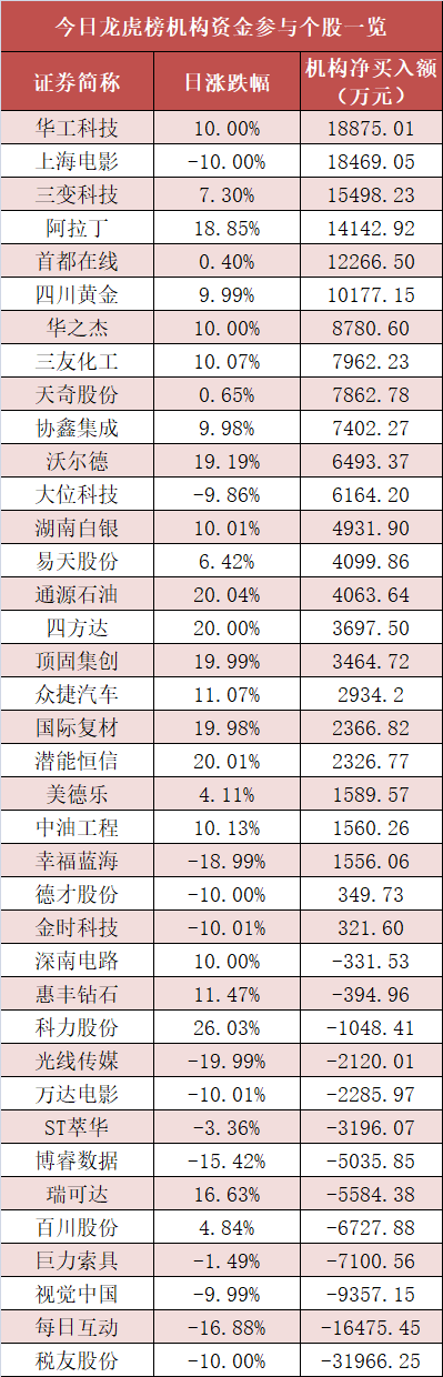 盘后龙虎榜数据显示,机构现身多股,其中华工科技(000988)等股票呈现机构资金净买入,税友股份等股票呈现机构资金净卖出。