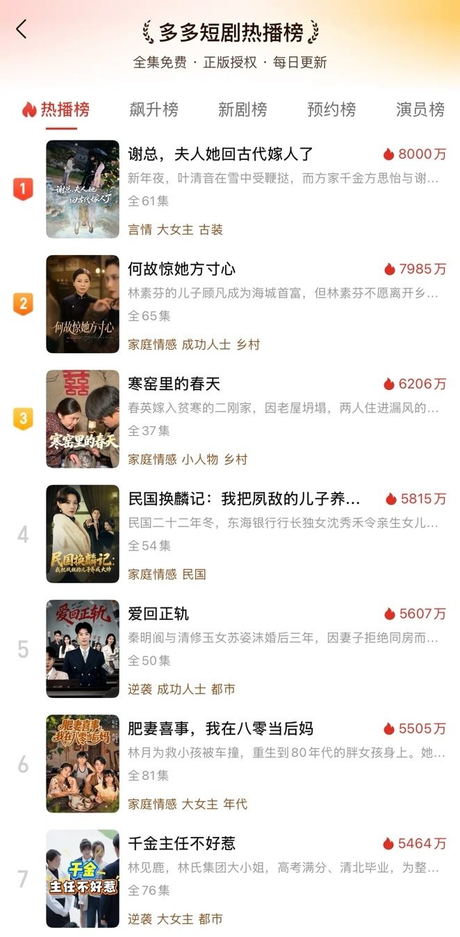 高完播率则成为下沉剧撬动下一轮投资的关键筹码。“拼多多上的完播率数据比不少平台还好,因为老年人能连续看十几个小时。”小七透露,当前投资人越来越看重完播率等核心数据,而非仅仅追求爆款。银发群体带来的高完播率,让片方能够用更亮眼的数据吸引下一轮投资。