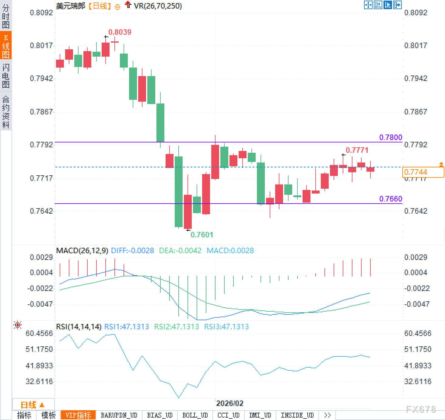 从技术图形审视,美元兑瑞郎正处于一个典型的修复与博弈阶段。日线图显示,汇价自0.8039高点回落后,在0.7601附近筑底,目前运行于0.7660至0.7800的箱体区间中上部。0.7800构成了上方难以逾越的“天花板”,若无法有效突破此压力带,汇价极易冲高回落;反之,0.7660则是下方的关键防线,一旦失守,市场恐将再度试探0.7601的前低支撑。动量指标MACD虽显示柱体转正,DIFF与DEA分别位于-0.0028和-0.0042,表明下行动能衰竭且修复意愿抬头,但双线仍深陷零轴下方,意味着趋势性的反转尚未得到确认。RSI指标在47的中性略偏弱区域,进一步印证了当前行情“欲涨还休、困于震荡”的特征。