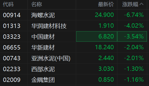 昨日走强的建材水泥股走低,其中,海螺水泥跌近7%,华润建材科技跌4%,中国建材跌3.5%,华新建材、亚洲水泥跌2%,西部水泥、金隅集团跌超1%。
