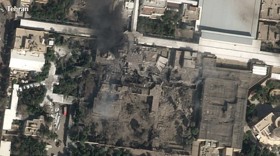 卫星图像显示,袭击后领袖官邸上空升起黑烟,画面显示官邸内多栋建筑遭严重损毁。