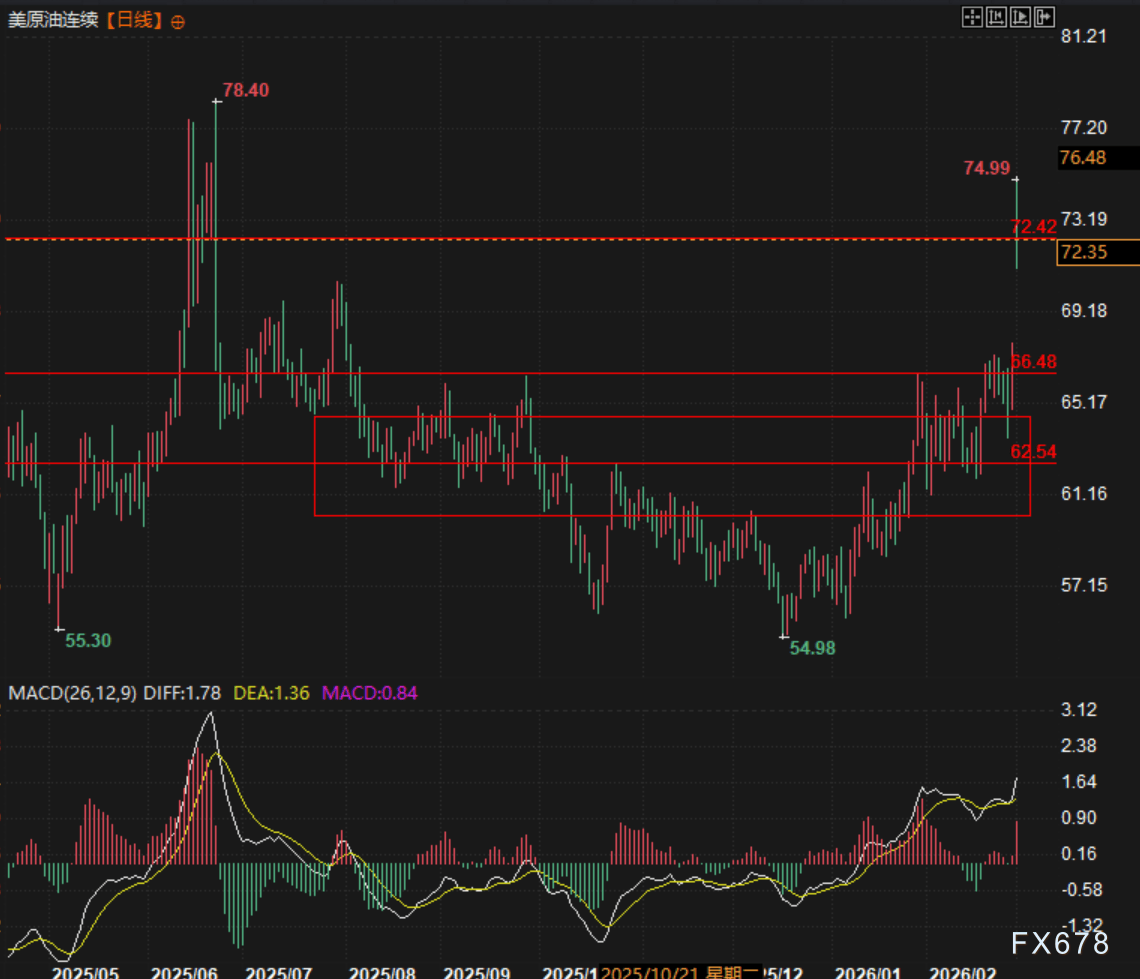 汇通财经APP讯――周一(3月2日)亚洲时段开盘,相比于高开1.5%的现货黄金,霍尔木兹海峡以及整体原油市场短期的供需极端不匹配对行情的影响更加明显,美原油期货连续一度高开12.8%,周末随着美伊冲突的超预期发展以及目前美方声称的战事的超预期推进,叠加伊朗现任外交部长明确发声无意关闭霍尔木兹海峡,原油走出冲高回落走势目前交投于72.72附近涨幅8.55%左右,同时周末OPEC+举行了八个欧佩克+产油国就产油政策举行月度会议。