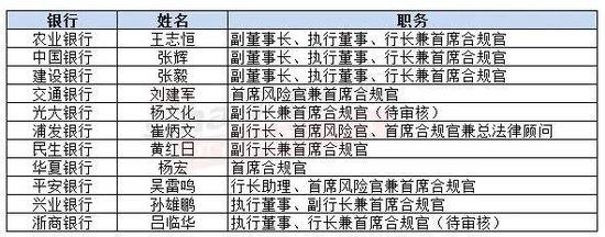 比如,2月11日,光大银行发布公告称,聘请杨文化为该行副行长兼首席合规官,任职资格待金监总局核准;1月24日,浦发银行聘任副行长崔炳文兼任公司首席风险官、首席合规官、总法律顾问。此外,去年12月,民生银行发布公告,聘任副行长黄红日为该行首席合规官;同月,兴业银行聘任副行长孙雄鹏为首席合规官。