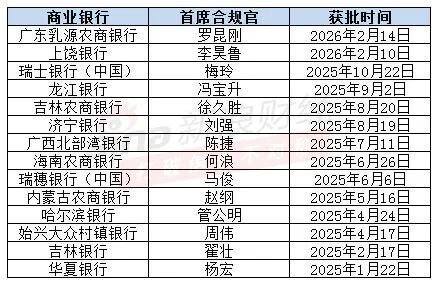实际上,除了上述银行,自去年以来,已有多家银行首席合规官任职资格获得金监总局核准,截至目前,2026年共计两家银行相关资格获批,包括广东乳源农商银行、上饶银行,均在今年2月获批。