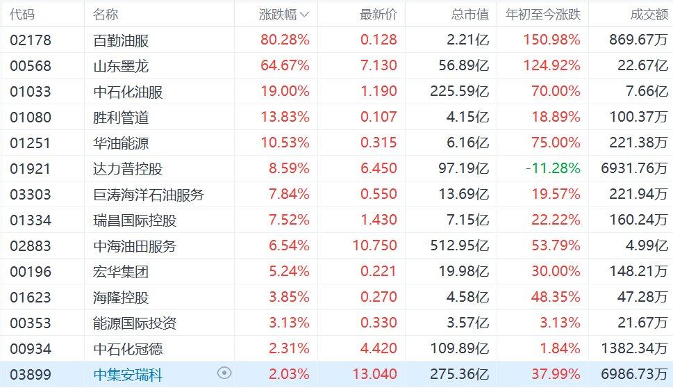 港股市场油气设备与服务股涨幅不断扩大,其中,百勤油服涨超80%,山东墨龙涨超64%,中石化油服涨19%,胜利管道涨超13%,华油能源涨超10%,达力普控股涨超8%,巨涛海洋石油服务、瑞昌国际控股涨超7%,中海油田服务涨超6%,宏华集团涨超5%。