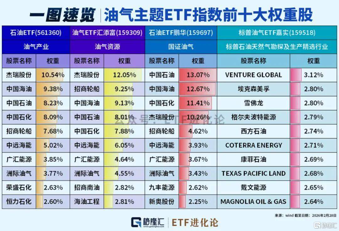 目前A股市场有10只油气相关ETF跟踪4个指数:油气产业覆盖上中下游全产业链,侧重“三桶油”+炼化+油服;油气资源聚焦上游开采与资源龙头,对油价敏感度更高;国证油气纳入油运、燃气等标的,行业覆盖面最广;标普油气聚焦美股油气上游,以勘探、生产为主,辅以炼化销售、综合性油气公司。