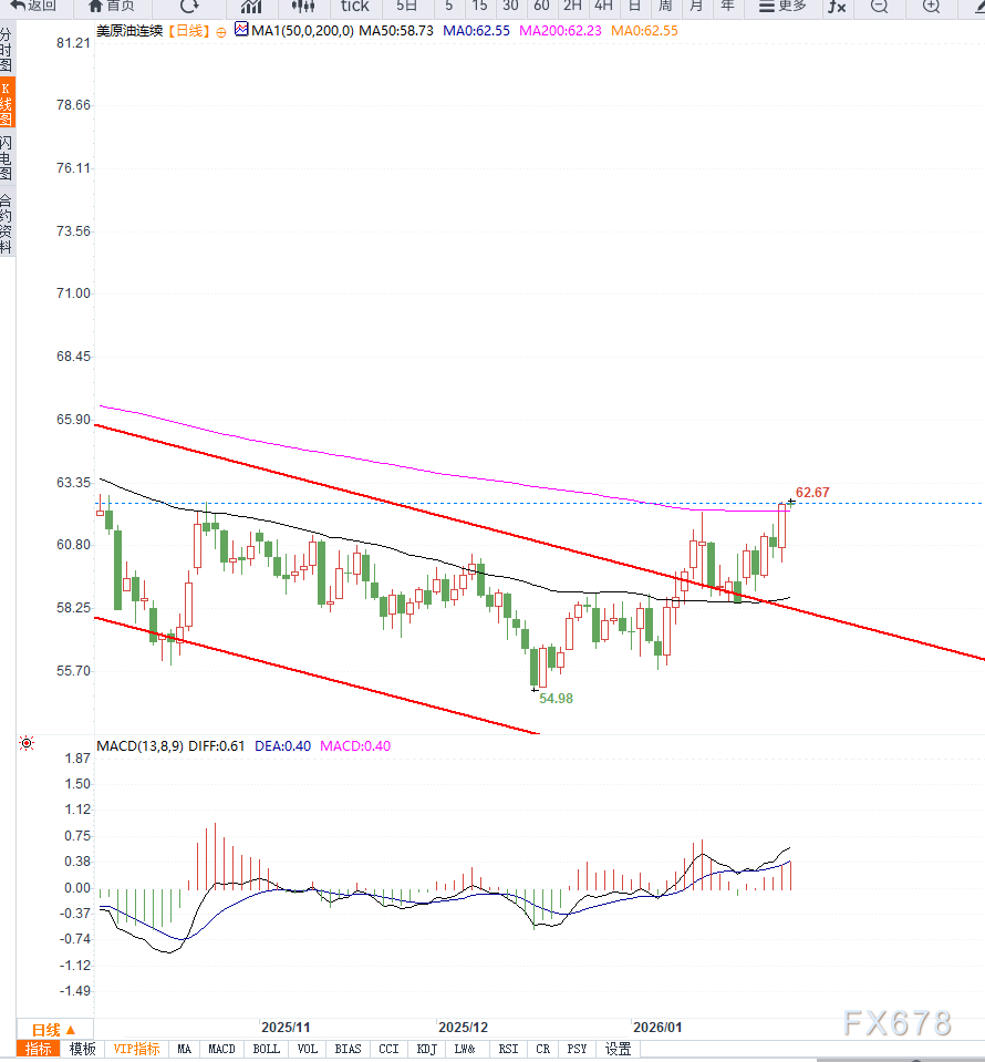 衡量美元走势的指标跌至 四年来更低水平,美元走软提升了以美元计价的大宗商品对非美投资者的吸引力,为油价提供了额外的上行动能。在基本面方面,尽管市场普遍预期今年全球原油供应仍可能偏宽松,但局部供应扰动正在改变短期供需平衡。哈萨克斯坦原油出口受阻令欧洲市场供应趋紧,而美国近期遭遇的大范围冬季风暴,也短暂影响了墨西哥湾沿岸部分炼油厂运行及少量原油产出。衍生品市场的变化同样值得关注。WTI 原油期货的看涨期权偏斜已连续维持近两周,为2024年10月以来持续时间最长,显示资金在不断增加对油价上行风险的对冲需求。从其他能源品种来看,在寒潮推动天然气价格大幅飙升后,美国天然气期货出现回落,纽约柴油期货同步走低,显示极端天气对不同能源品种的影响正在出现分化。从技术走势来看,WTI原油在近期完成了关键的区间突破,价格脱离此前持续数周的震荡整理平台,显示多头重新掌握短线主导权。日线级别上,油价连续收于短期与中期均线之上,均线系统开始向上发散,表明市场的趋势方向已由震荡逐步转向偏多结构。动能指标方面,相对强弱指数(RSI)在快速上行后维持在偏强区域运行,但尚未出现明显的极端超买信号,这意味着当前上涨并非完全由情绪推动,仍具备一定的技术延续基础。同时,成交量的放大配合价格突破,也增强了此次上行的有效性,暗示资金在高位并未急于离场。从价格结构观察,62美元一线已由此前的压力区间转化为短期支撑,这一水平对后续走势至关重要。若油价在回调过程中能够守稳该区域,技术形态将保持完好,多头有望继续测试上方63.50至64.00美元区间的前期密集成交区域。不过,该位置叠加历史高点和心理关口,预计将引发一定的获利了结压力,短期内油价在此附近出现震荡的可能性较高。综合判断,WTI 原油当前处于趋势转强后的确认阶段,技术面整体偏向多头,但随着价格接近关键阻力区间,市场波动性可能同步上升。在地缘政治与宏观因素未出现明显缓和之前,油价更可能以高位震荡、重心缓慢上移的方式运行,而非出现单边快速回落。