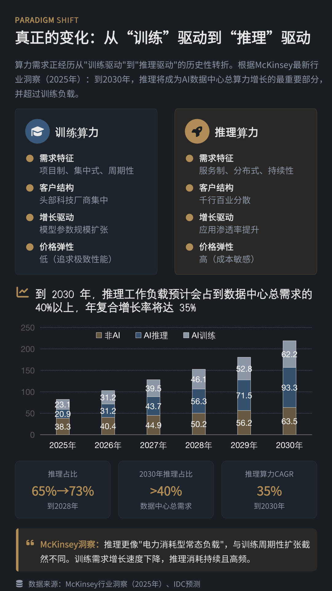 报告认为,人工智能算力需求正经历从“训练驱动”向“推理驱动”的历史性转变。咨询机构McKinsey & Company预计,到2030年全球推理工作负载将占数据中心总算力需求的40%以上,并成为未来算力增长的主要来源。与集中式训练需求不同,推理算力更具持续性与分布式特征,对数据中心的 *** 延迟、部署位置及能效水平提出更高要求。