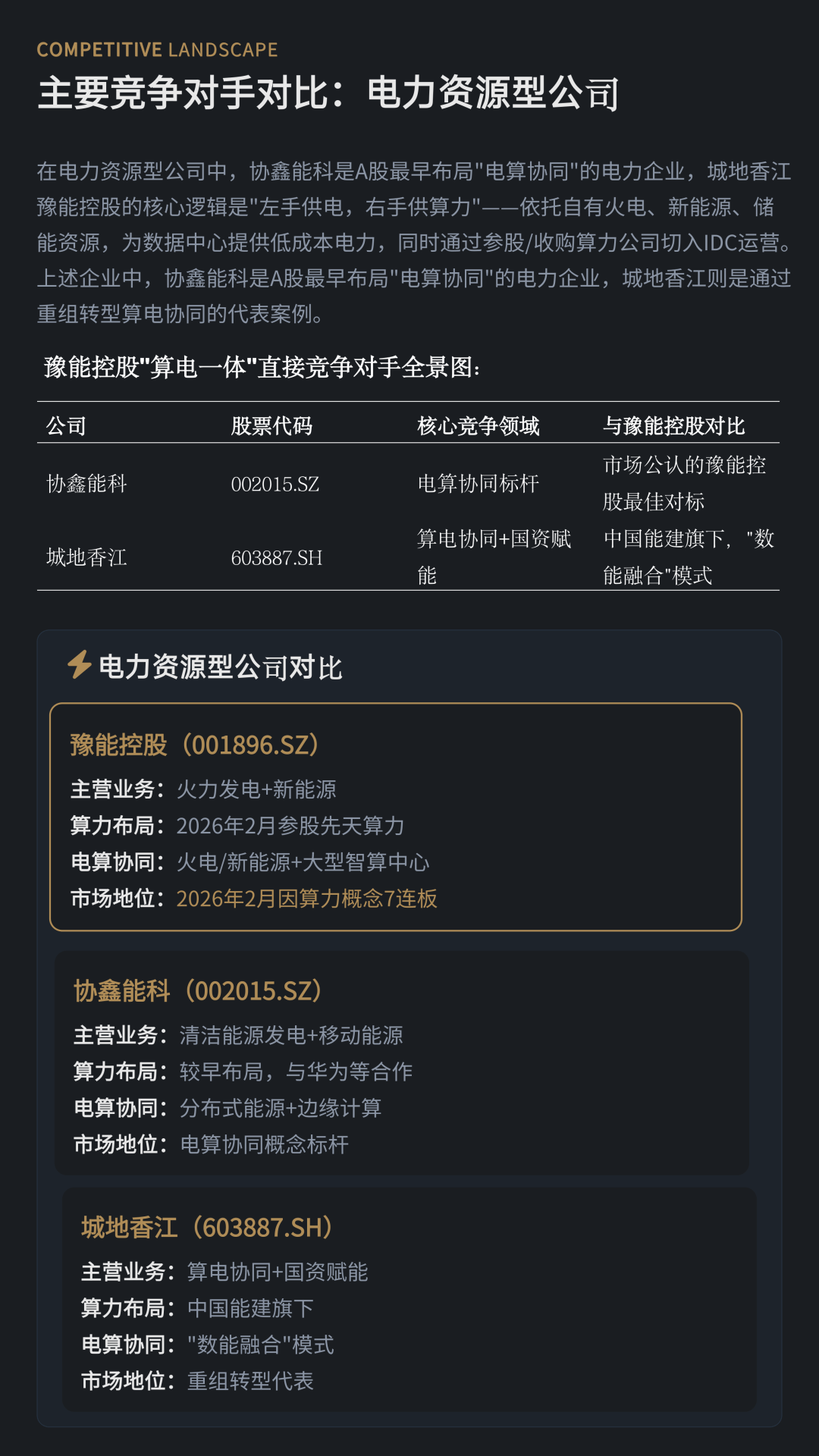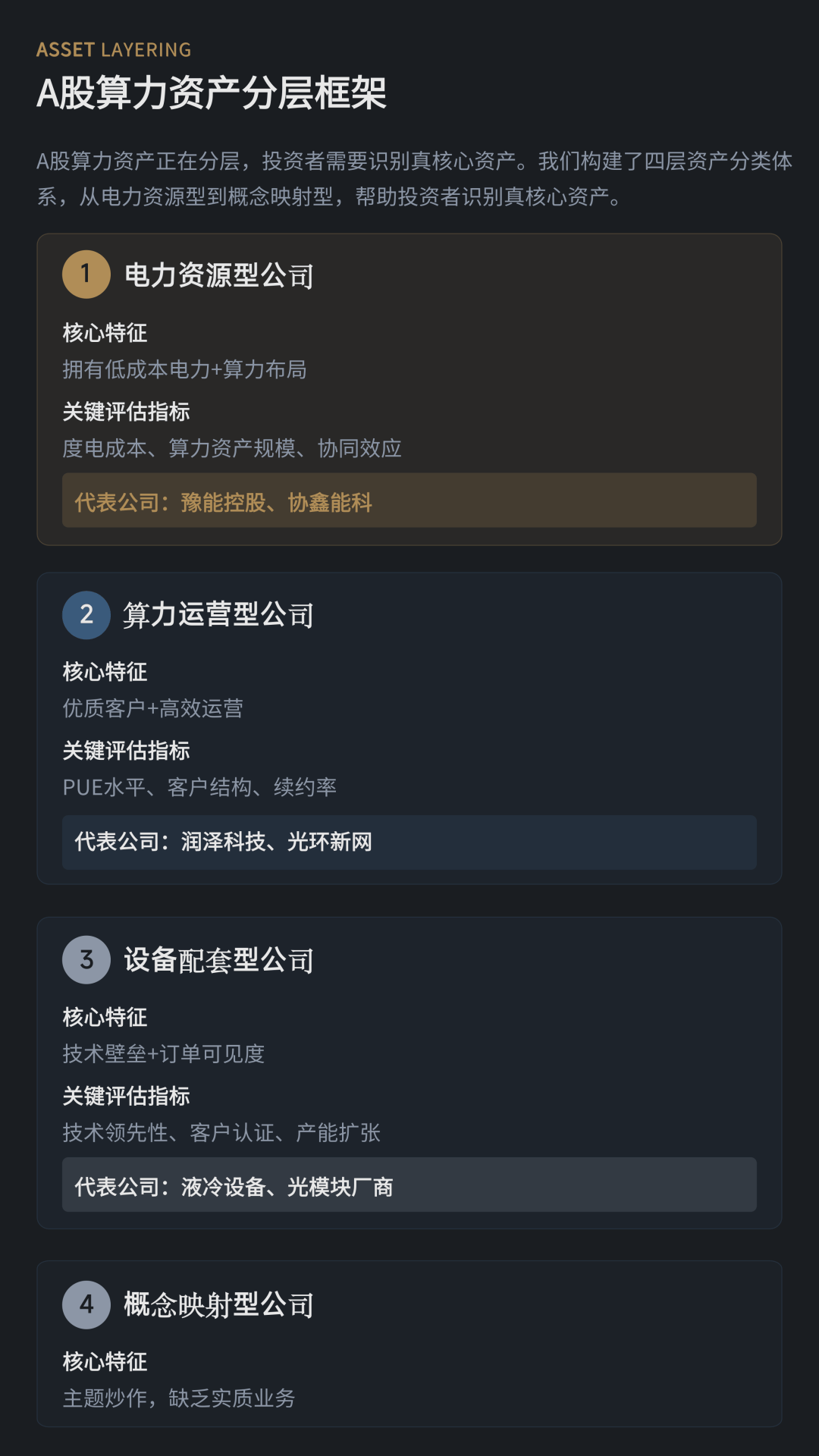 基于产业链演进,报告提出A股算力资产的“四层分化”框架,包括电力资源型企业、算力运营型企业、设备配套型企业以及概念映射型企业,并提示市场应更加关注具备稳定电力资源、运营效率和正向现金流能力的核心资产。例如电力资源与算力协同布局的豫能控股(001896),以及以液冷智算中心为代表的算力运营商润泽科技,均是当前产业转型的重要样本。