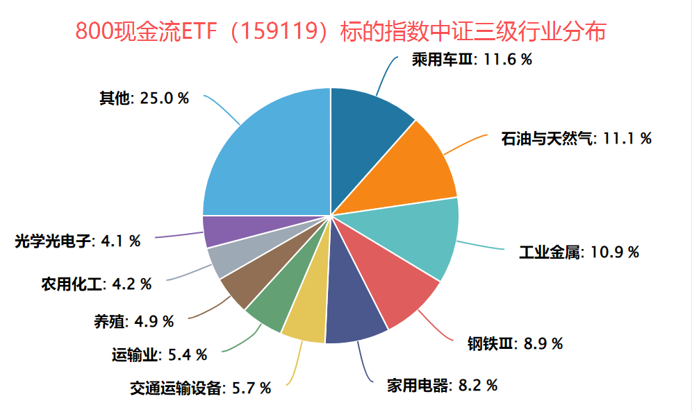 从行业分布上来看,800现金流ETF(159119)跟踪中证800自由现金流指数,标的指数前6大行业分别为乘用车III(12%)、石油与天然气(11%)、工业金属(11%)、钢铁III(9%)、家用电器(8%)和交通运输设备(6%)――聚焦资源制造/消费/轻、重资产科技等行业现金流边际改善的趋势,左侧布局价值突出。