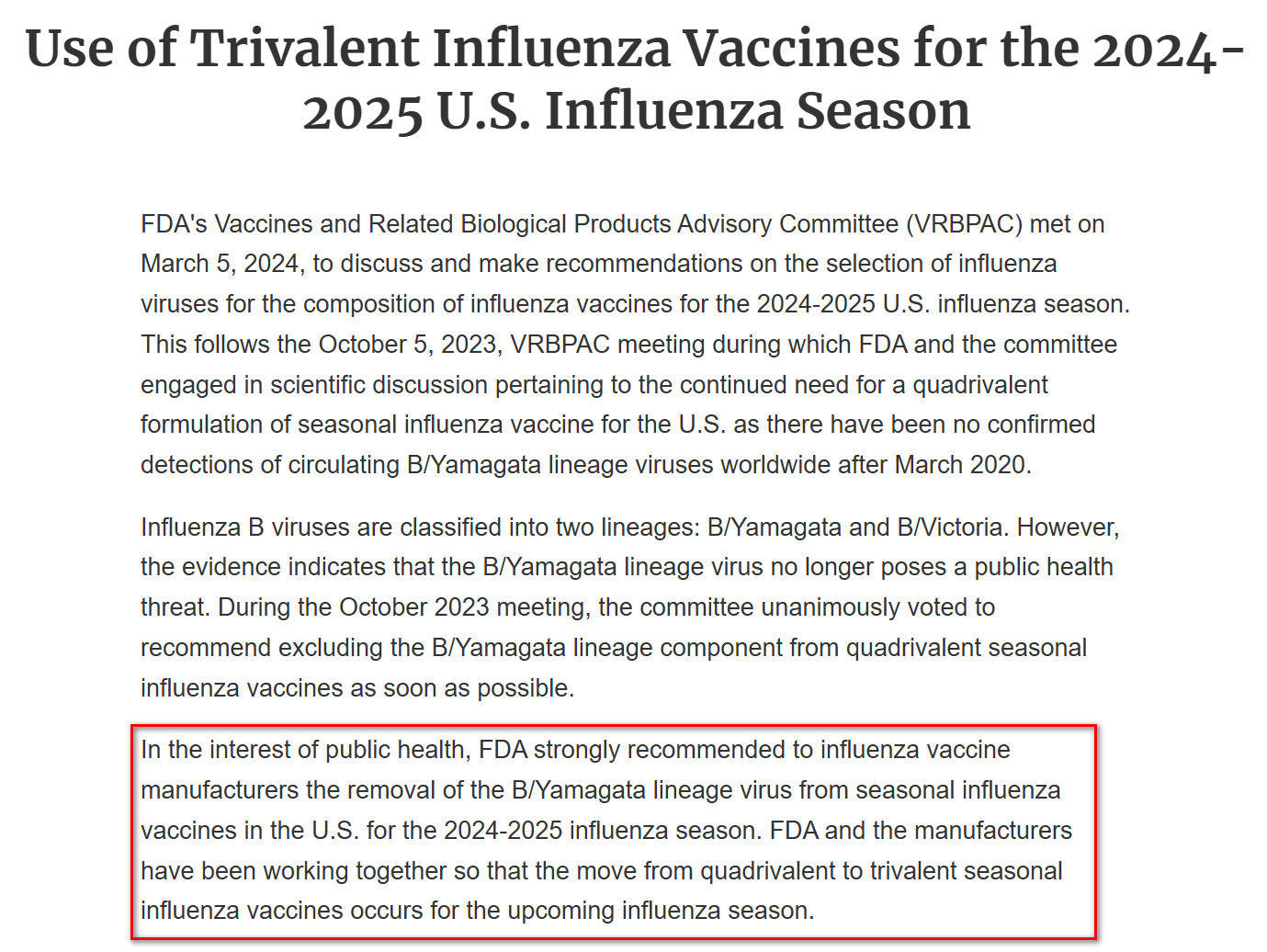 此前FDA已建议从美国季节性流感疫苗中去除B/Yamagata系毒株 图片来源:FDA官网