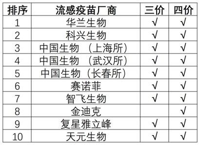 目前,裂解流感疫苗是我国广泛使用的流感疫苗。资料显示,2025年国内共有10家企业获得四价流感裂解疫苗批签发,排名前四的分别是华兰生物(002007)、科兴生物、中国生物(上海所)和赛诺菲;三价流感裂解疫苗共有7家企业获批签发,排名前三的分别是科兴生物、复星雅立峰和天元生物。