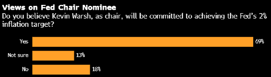 近三分之一受访经济学家也对凯文·沃什表示出疑虑。美国总统唐纳德·特朗普提名这位前美联储理事接替杰罗姆·鲍威尔担任美联储主席。当被问及是否相信沃什会致力于实现美联储2%的通胀目标时,13%的受访者表示不确定,18%明确表示“不相信”。