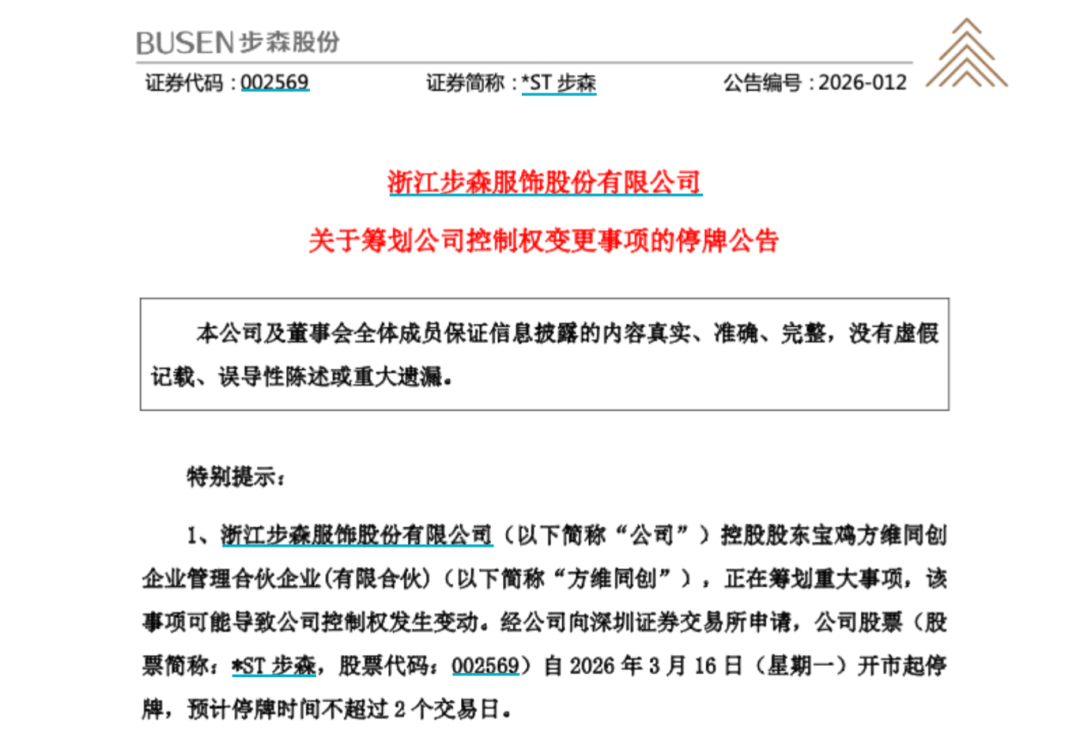 3月15日晚间,*ST步森(002569)公告称,控股股东宝鸡方维同创企业管理合伙企业(有限合伙)(以下简称“方维同创”),正在筹划重大事项,该事项可能导致公司控制权发生变动。经公司向深圳证券交易所申请,公司股票(股票简称:*ST步森,股票代码:002569)自2026年3月16日(星期一)开市起停牌,预计停牌时间不超过2个交易日。