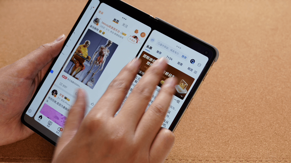 最后则是Find N6的独家手势交互:四指张开可以将一组零散的浮窗整理为规整的分屏;四指捏合则将分屏解绑, 切换方便。