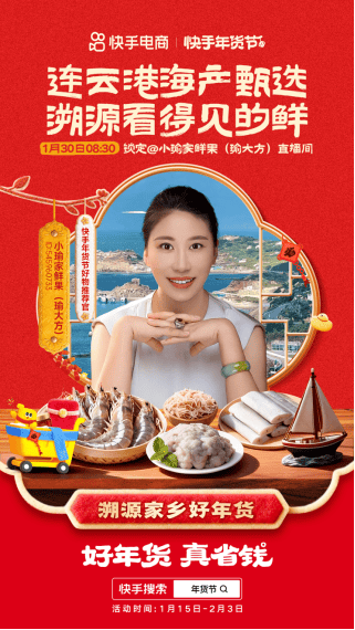 主播@小瑜家鲜果 将在1月30日走进连云港,围绕海产年货进行溯源直播。龙虾尾、大虾、带鱼段等年货高频品类,将从产地加工、冷链运输到成品标准,在直播间逐一呈现。通过实地探访,小瑜将把海鲜年货背后的产地条件、分拣流程和品质要点讲清楚,让用户在年货选购时更有底气。