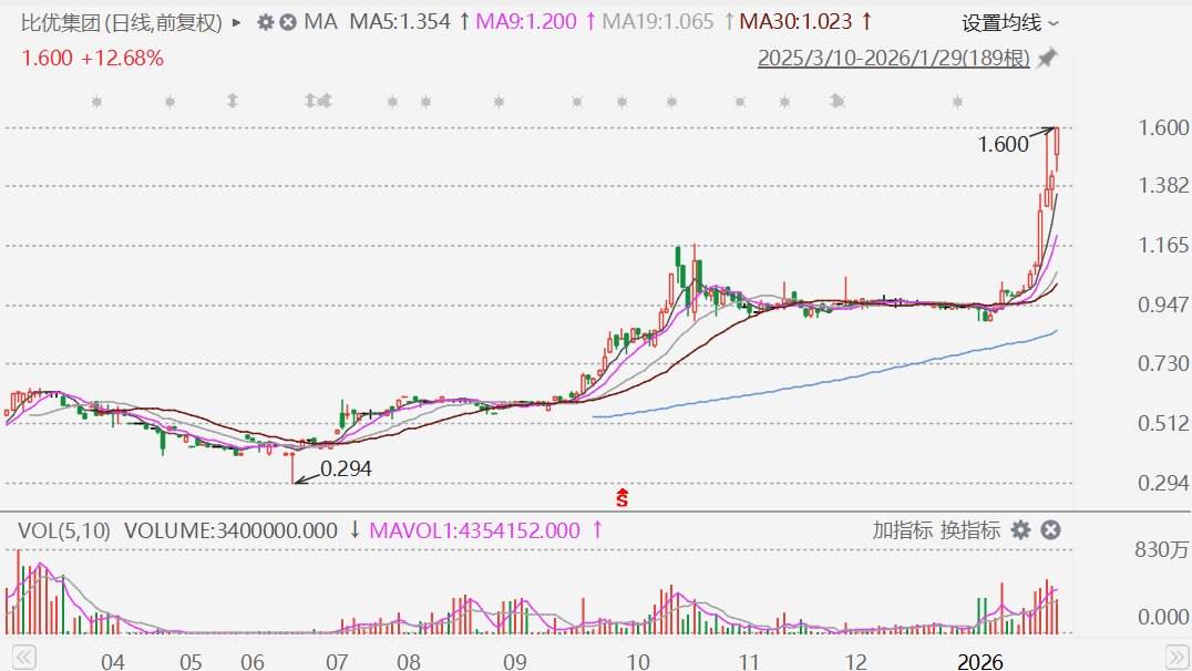 延续近期强势,港股市场的“矿山”概念股比优集团(9893.HK)今日盘中再度涨超12%至1.6港元,创历史新高,总市值超56亿港元。消息面上,现货黄金延续涨势,今日盘中一度冲高至5595.41美元/盎司,再创新纪录。现货黄金本周累涨超600美元,累涨幅度超12%。