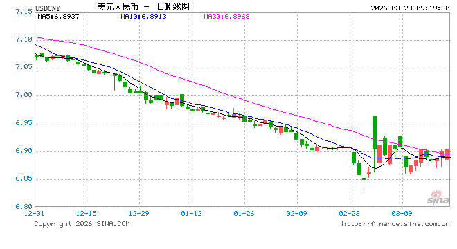 3月23日,人民币兑美元中间价报6.9041,下调143点。
