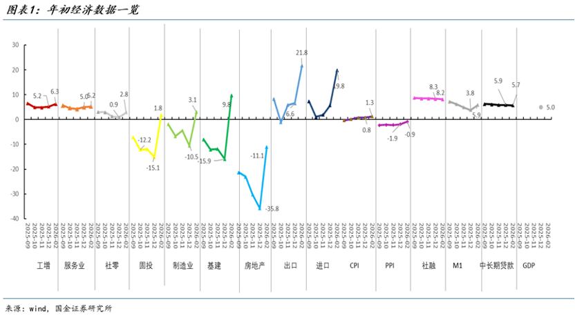 1-2月中国经济顺利实现开门红,核心经济指标表现均优于去年12月:出口、工业增加值大幅高开,固定资产投资同比转正,服务业生产指数小幅高于前值,社会消费品零售总额虽表现偏弱但较前值有所改善,房地产销售虽延续弱势但降幅较前值收窄,PPI同比降幅亦呈持续收窄态势。