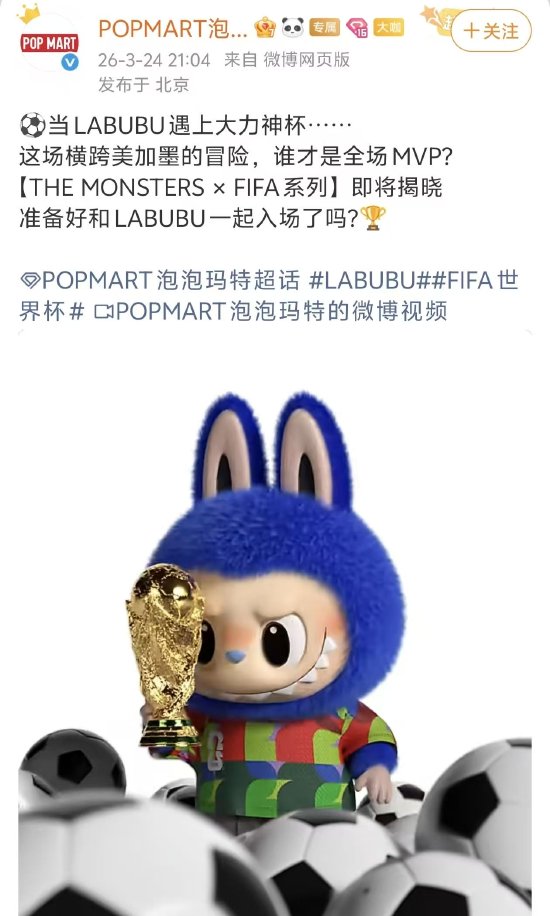 昨日(3月24日),泡泡玛特官方账号发文称,“THE MONSTERS × FIFA系列”即将揭晓。这是泡泡玛特与国际足联(FIFA)联名推出的Labubu世界杯系列潮玩,本次联名的核心是THE MONSTERS ,主角为大热IP Labubu。从在社交媒体上已曝光的实物显示,Labubu将化身足球小将,手捧金色大力神杯。此外,可能同步开发世界杯主题周边产品。