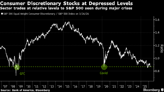 Hartnett强调,鉴于对通胀和经济增长放缓的担忧,美国消费类股票是他“最看好的逆向做多”标的。他作出这一判断之际,该板块相对于标普500指数的估值接近低点,与新冠疫情和全球金融危机等市场危机时期的水平相当。
