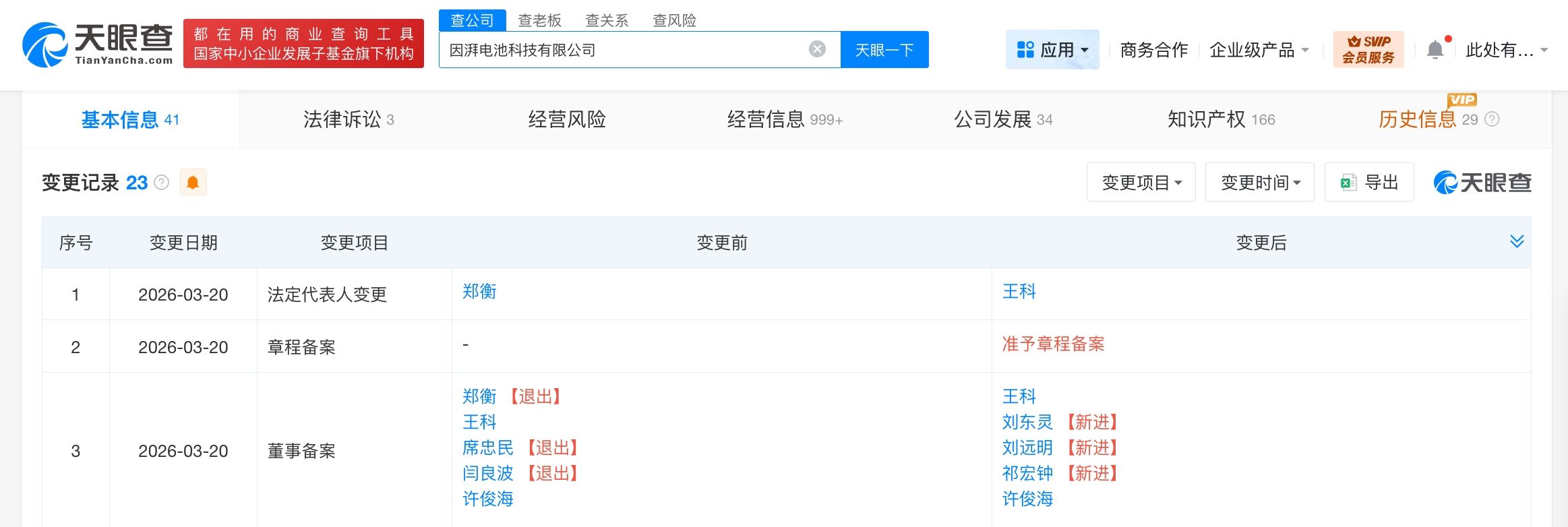 天眼查工商信息显示,近日,因湃电池科技有限公司发生工商变更,郑衡卸任法定代表人、董事长,由王科接任法定代表人并由董事改任为董事长,同时,多位高管发生变更。
