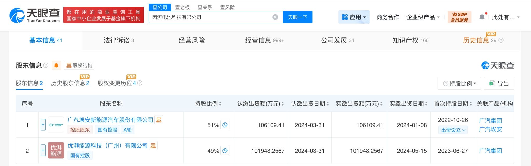 因湃电池科技有限公司成立于2022年10月,注册资本约20.8亿人民币,经营范围含电池零配件生产、电容器及其配套设备销售、再生资源加工、机械设备销售、电池制造、新能源汽车废旧动力蓄电池回收及梯次利用等。股东信息显示,该公司由广汽埃安新能源汽车股份有限公司、优湃能源科技(广州)有限公司共同持股。