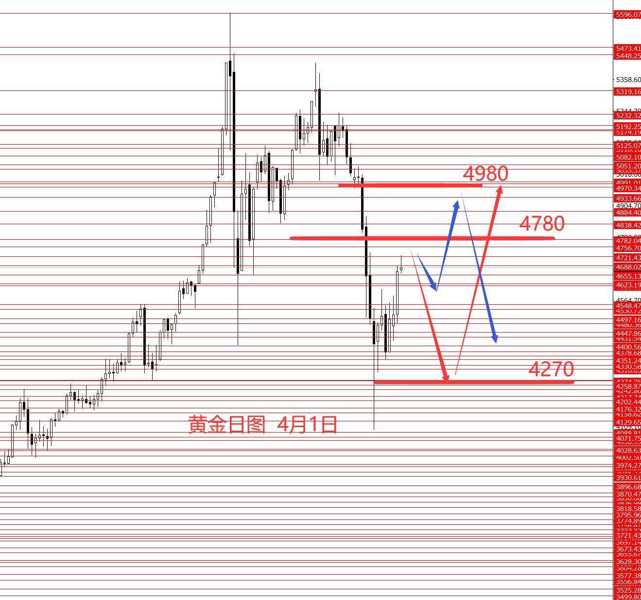 黄金三月也正如预期从5370跌至4780,更低4100附近,黄金中线波段思路正确。从图形来看,黄金四月区间震荡的概率相对较大些,区间先关注5000至4270,本月二次下探4270的概率相对较大些,只是不确定是先测试了5000再跌,还是连4780都上不去先下探4270再向上测试5000区域。今日没有具体操作建议,只有一个大概框架,重点关注周五非农数据,下周一行情明朗些会再更新文字稿件,大家敬请期待。
