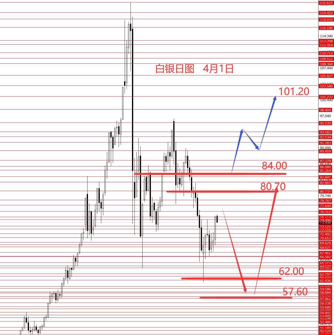 白银三月正如预期反转下行,89.50二次探顶下跌,目标75.10和73都已到位,更低61附近企稳震荡。从图形来看,白银本月二次探底的概率较大些,甚至再创新低的可能,上方重点关注78.50和84.00区域的强阻力,在84没上破前,二次探底的概率较大些,下方重点关注62附近,如果创新低则关注57.60区域。白银只有成功站稳84.00上方,才能打开另一个上涨空间,向上测试94和101和概率才会加大。今日一样只有框架分析,没有具体操作建议。