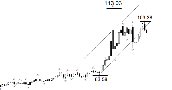行情走势方面,日线级别,自从3月16日以来,美原油一直保持横盘震荡状态,虽然屡次突破100美元整数关口,但是无法有效扩大涨幅。本周二更高触及103.38美元,随后连跌两日,最新价已经处于上升通道下轨之外。如果本周没有出现大幅度反弹,收盘价一直处于通道线下方,可能意味着美原油的涨势结束。一旦美伊冲突显现缓和迹象,美原油可能迎来剧烈下跌。