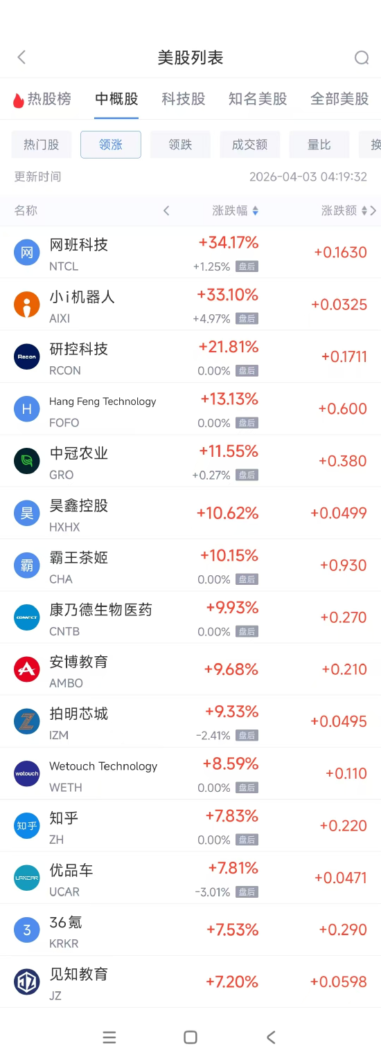 上涨股当中(按市值从高到低),网易涨0.13%,中华电信涨0.01%,携程涨1.39%,富途控股涨0.09%,中通涨0.65%,理想汽车涨0.49%,小鹏汽车涨1.09%,华住酒店集团涨1.18%,蔚来涨1.45%,中国新城农村涨2.80%,哔哩哔哩涨0.70%,BOSS直聘涨0.30%,WSP控股涨0.88%,小马智行涨0.11%,禾赛科技涨0.63%,欢聚涨0.34%。