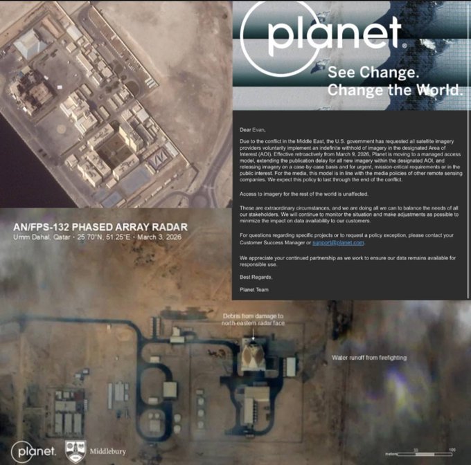 美国 *** 已要求所有卫星影像服务商自愿无限期暂停指定区域(感兴趣区域AOI)内的影像发布,此前伊朗发动的打击暴露了美军基地受损情况。