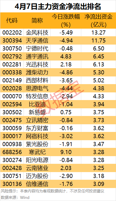 据数据宝统计,29股主力资金净流出超2亿元,其中金风科技(002202)、天孚通信(300394)、宁德时代(300750)、通宇通讯(002792)、光迅科技(002281)、潍柴动力(000338)、西部材料(002149)等主力资金净流出金额居前。
