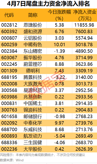 盛和资源、云铝股份(000807)、中稀有色、东山精密(002384)、振华股份(603067)尾盘主力资金净流入均超0.3亿元。