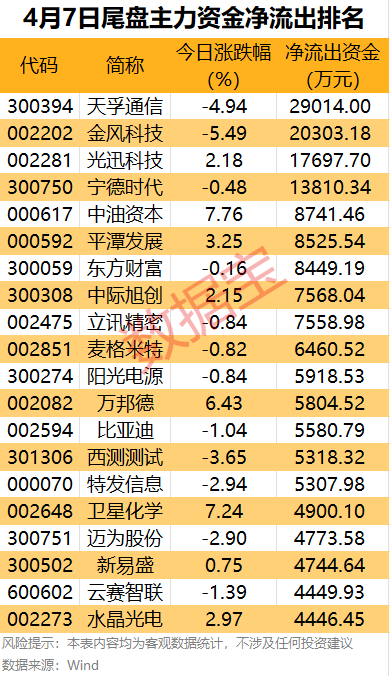 从尾盘净流出来看,天孚通信、金风科技、光迅科技等4股尾盘主力资金净流出均超1亿元。